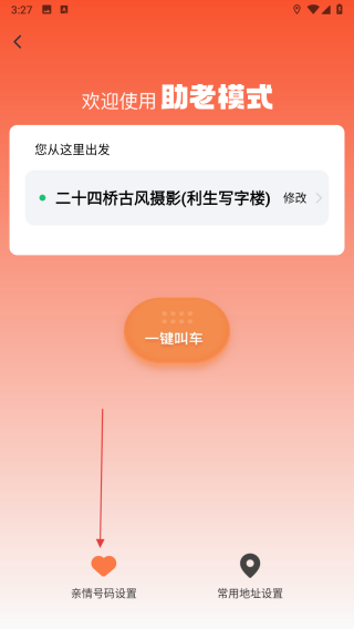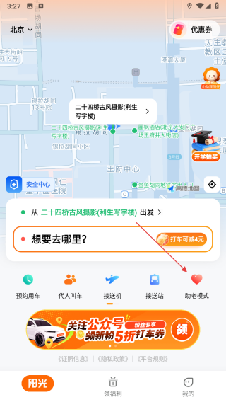 1、打开阳光出行APP,在首页点击助老模式选项,进入助老模式界面。