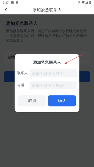 4、在弹出的添加紧急联系人弹窗中,输入联系人姓名和电话,点击确认按钮,完成亲情号码的设置。