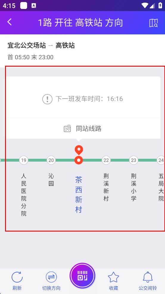 3、在“1路 开往 高铁站 方向”的详情页面,即可查看该线路的首末班车时间、下一班发车时间以及站点等详细信息。