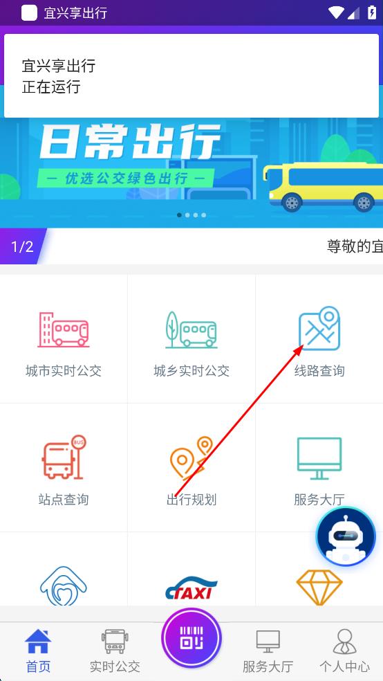 1、打开宜兴享出行软件,在主界面找到“线路查询”选项,点击该选项,进入线路查询页面。