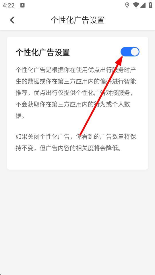 4、在个性化广告设置页面,可通过点击个性化广告设置右侧的开关按钮,来开启或关闭个性化广告功能。