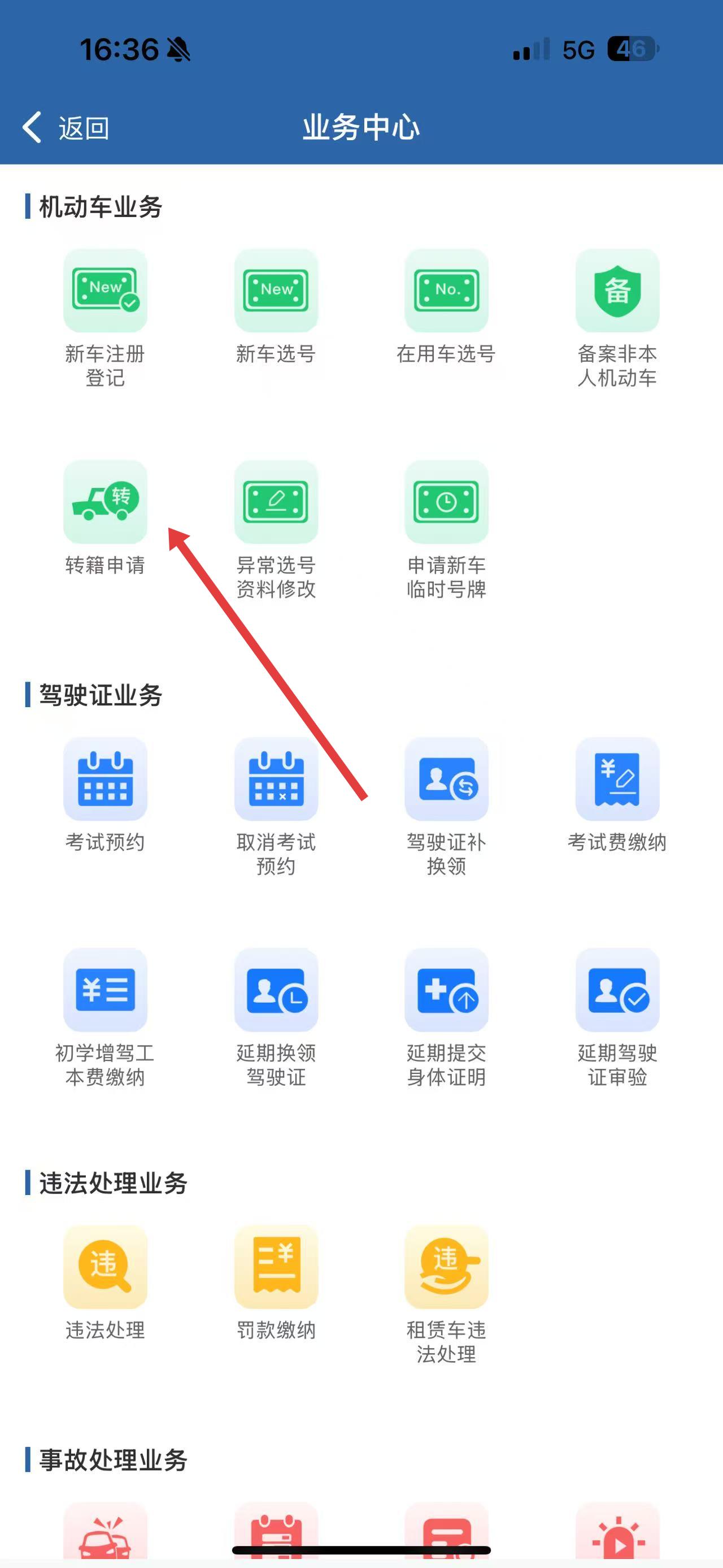 1、打开交管12123APP,进入业务中心,点击转籍申请进入转籍业务办理界面。
