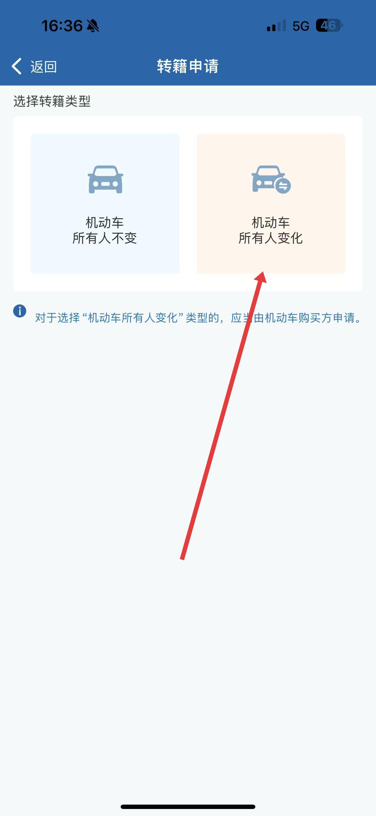 2、在转籍申请界面,根据实际情况选择机动车所有人变化等转籍类型选项。