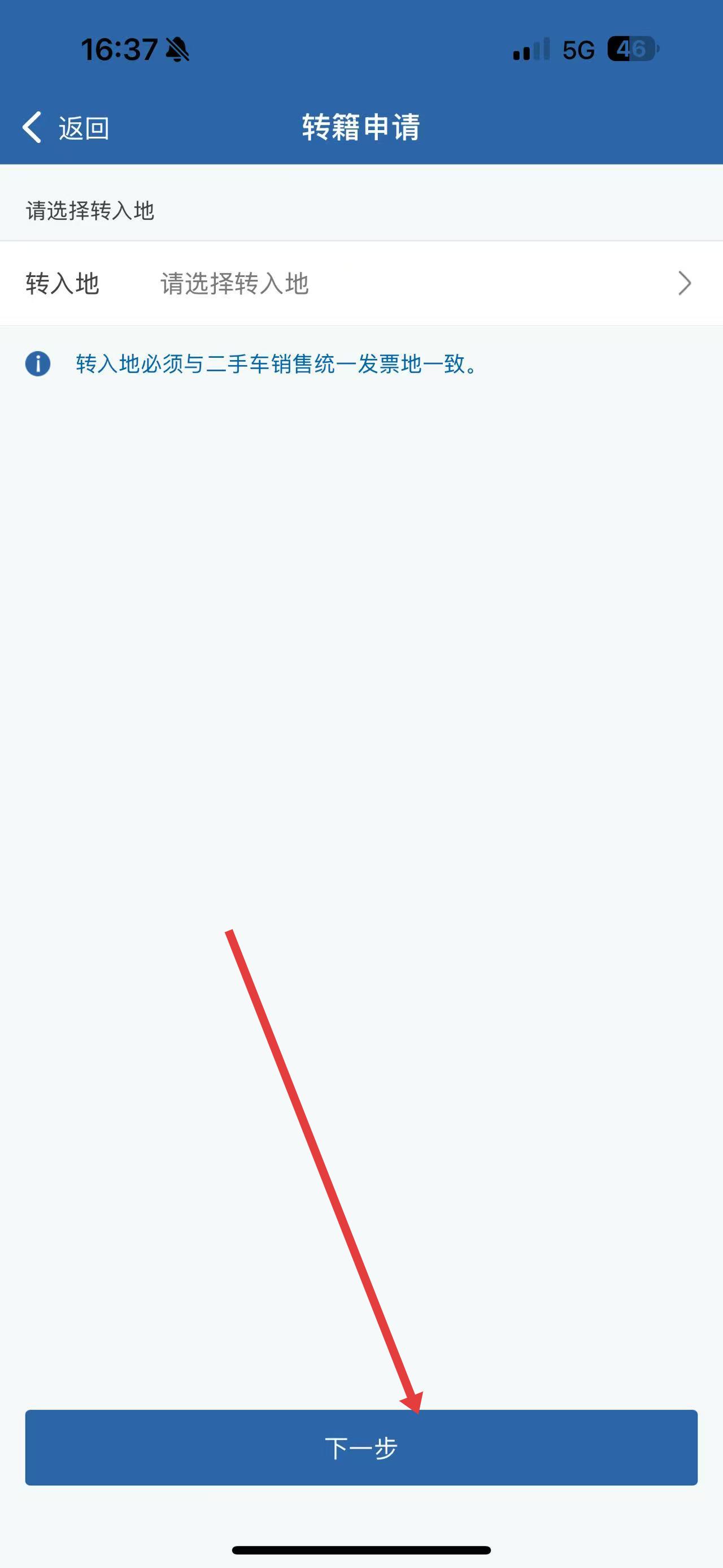 3、选择车辆的转入地,确保转入地与二手车销售统一发票地一致,然后点击下一步,按指引完成后续操作。