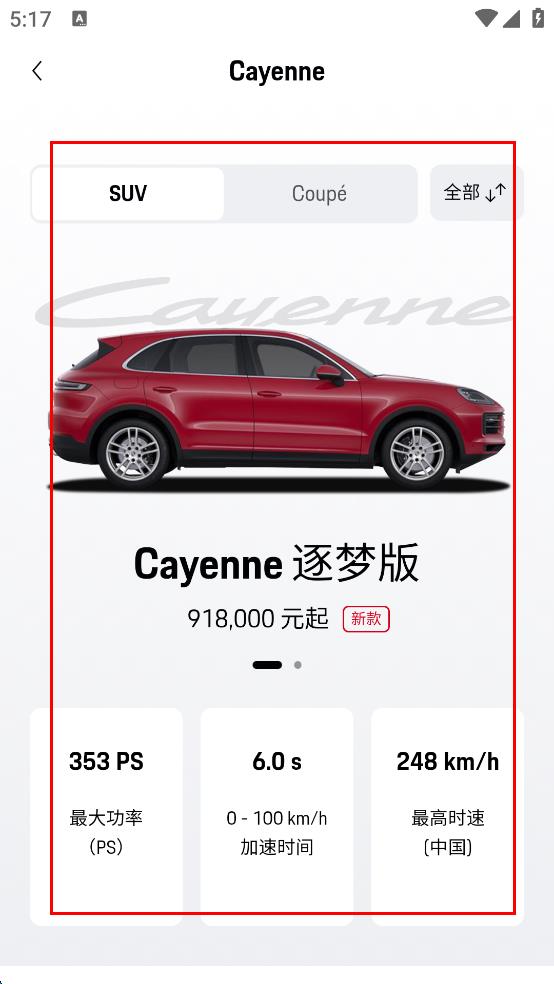 3、在“Cayenne”车型的详细信息页面,即可查看该车型的外观、价格以及最大功率、加速时间、最高时速等性能参数。