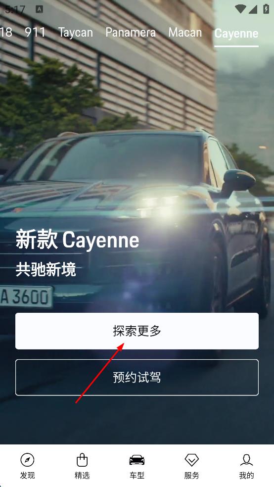 2、在车型展示页面,找到“Cayenne”车型相关区域,点击“探索更多”按钮,进入“Cayenne”车型的详细信息页面。