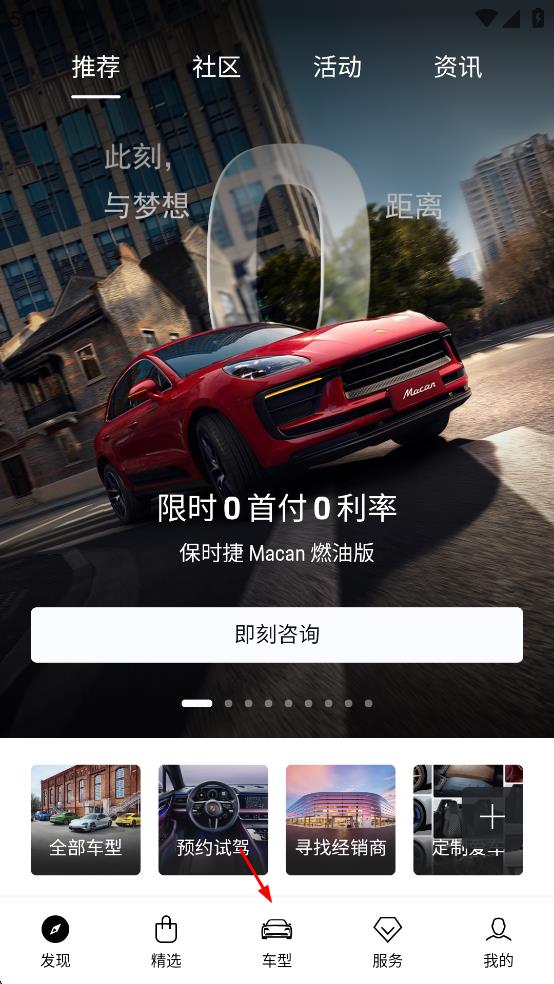 1、打开保时捷汽车相关软件,在底部导航栏找到“车型”选项,点击该选项,进入车型展示页面。