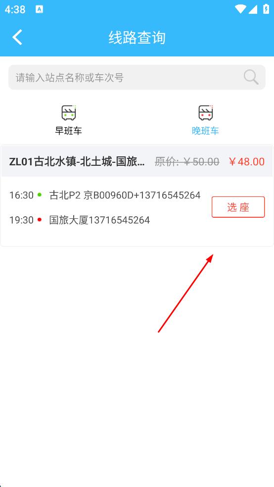 3、在线路查询页面,找到目标班车,点击“选座”按钮,进入座位预定页面。