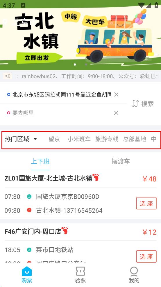 2、在购票页面,选择热门区域等分类,找到想要乘坐的班车线路,点击进入该线路的查询页面。