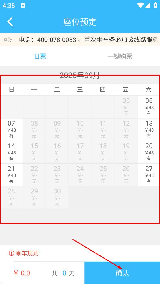 4、在座位预定页面,选择乘车日期,然后点击“确认”按钮,完成班车座位的预订操作。