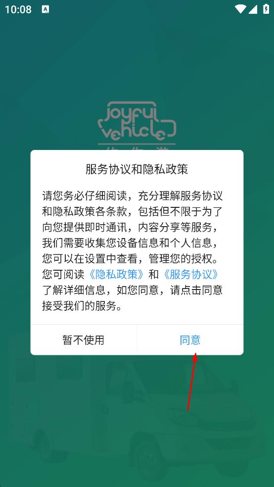 1、打开伊哒旅游应用,在服务协议和隐私政策界面,点击同意,进入应用主界面。