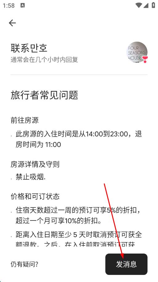 3、进入与房东的沟通页面,若有常见问题会先展示,如仍有疑问,点击下方的发消息按钮。