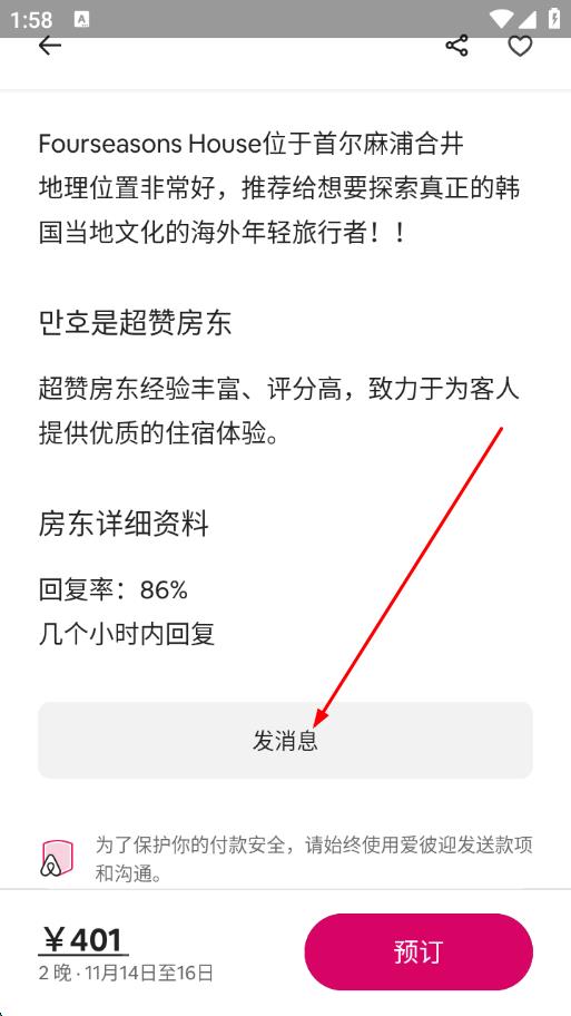 4、在输入框内输入你想要询问房东的内容,发送消息,即可将信息发送给房东。