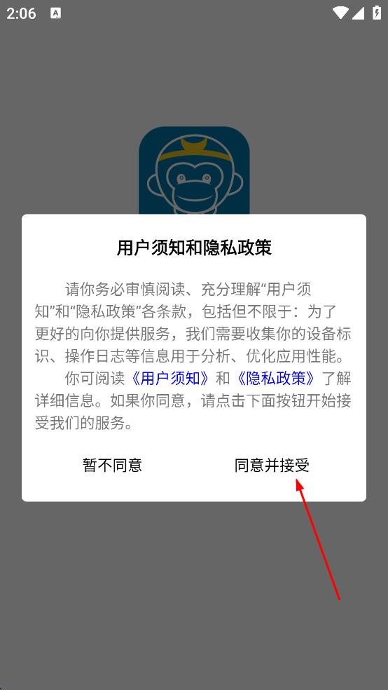 1、打开连e行软件,会弹出“用户须知和隐私政策”提示框,点击“同意并接受”按钮,进入软件主界面。