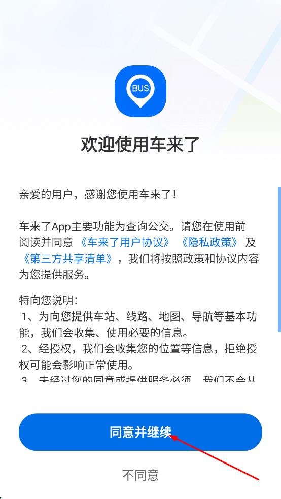 1、打开车来了APP,在欢迎使用界面,仔细阅读相关协议内容后,点击同意并继续,进入APP主界面。