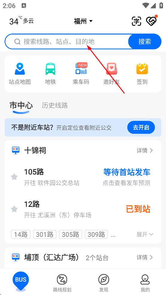 2、在APP主界面,点击搜索框,输入想要查询的公交线路、站点或目的地,进行搜索操作。
