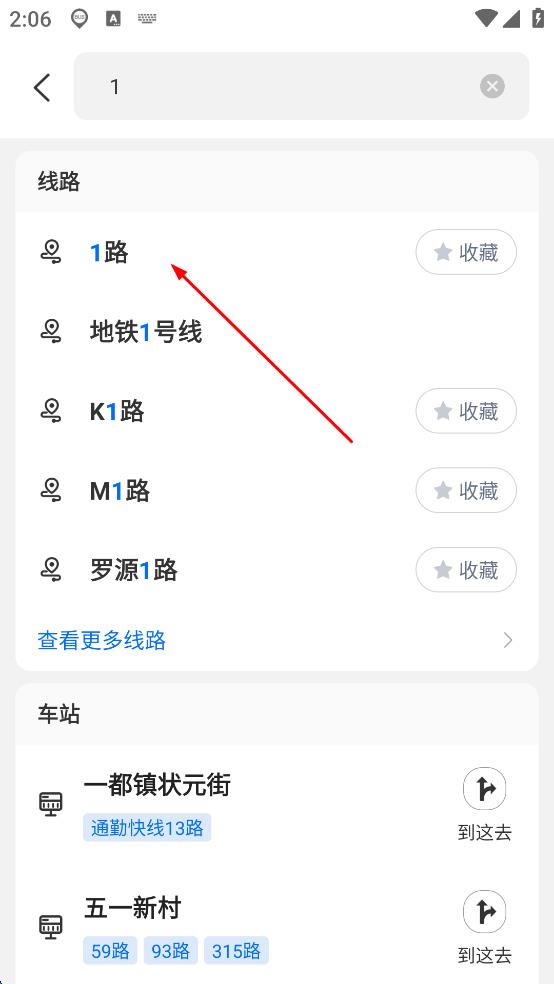 3、在搜索结果页面,选择对应的公交线路,比如1路,点击进入该线路的详细信息页面。