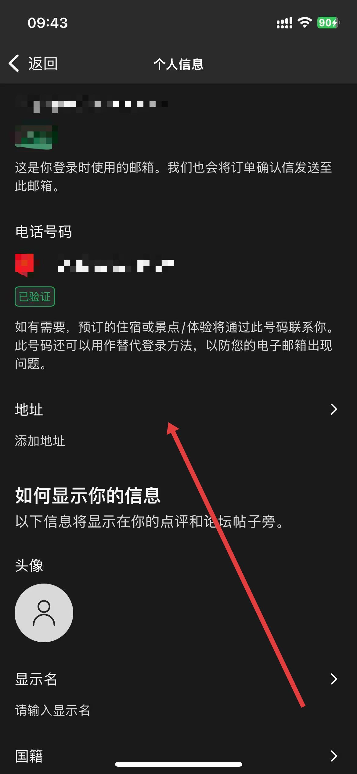 3、在个人信息页面中,下滑找到地址选项并点击。