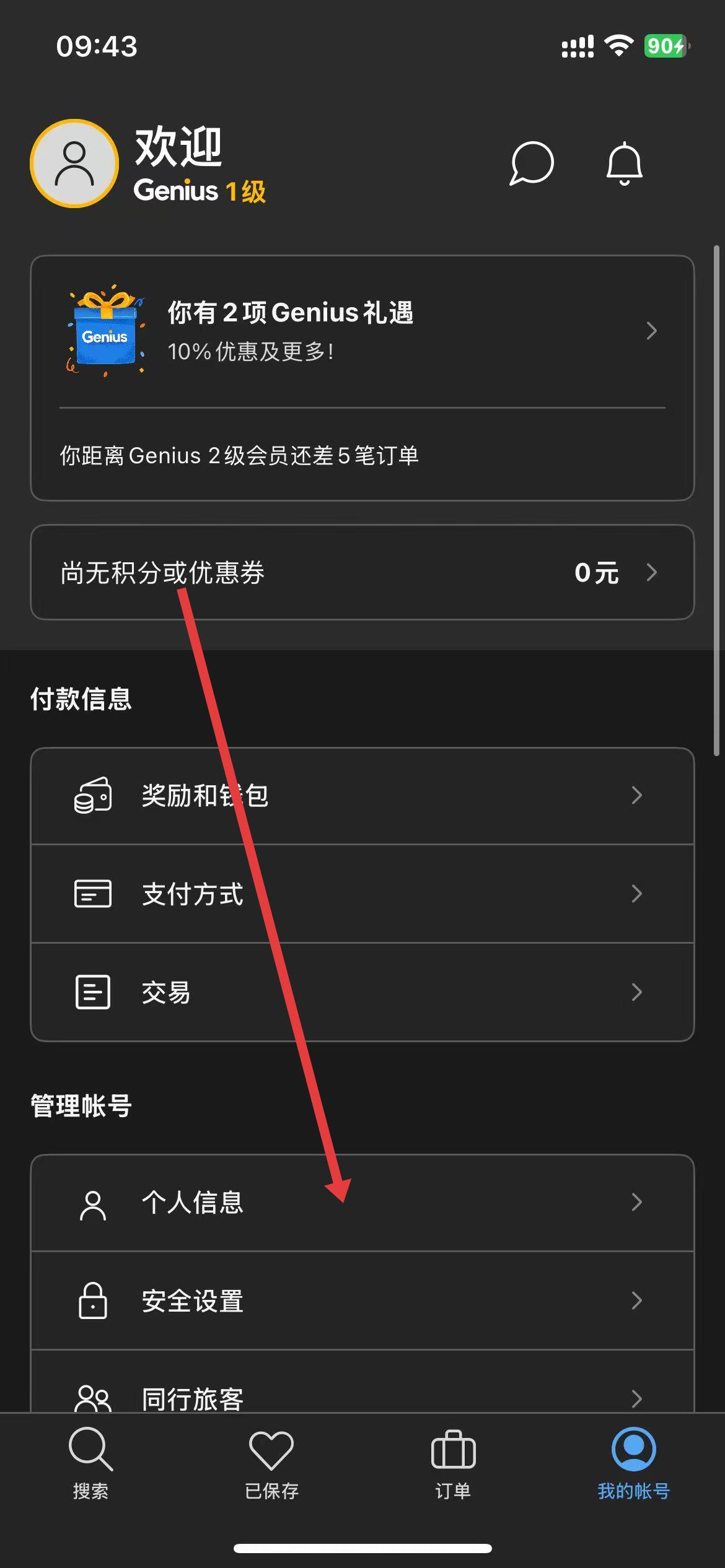 2、在个人账号页面下滑找到并点击个人信息选项。