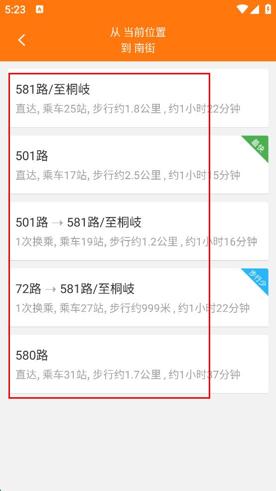 3、路线规划完成后,在展示的多条公交出行方案中,可查看每条方案的公交线路、乘车时长、步行距离等信息,根据需求选择合适的公交出行路线。