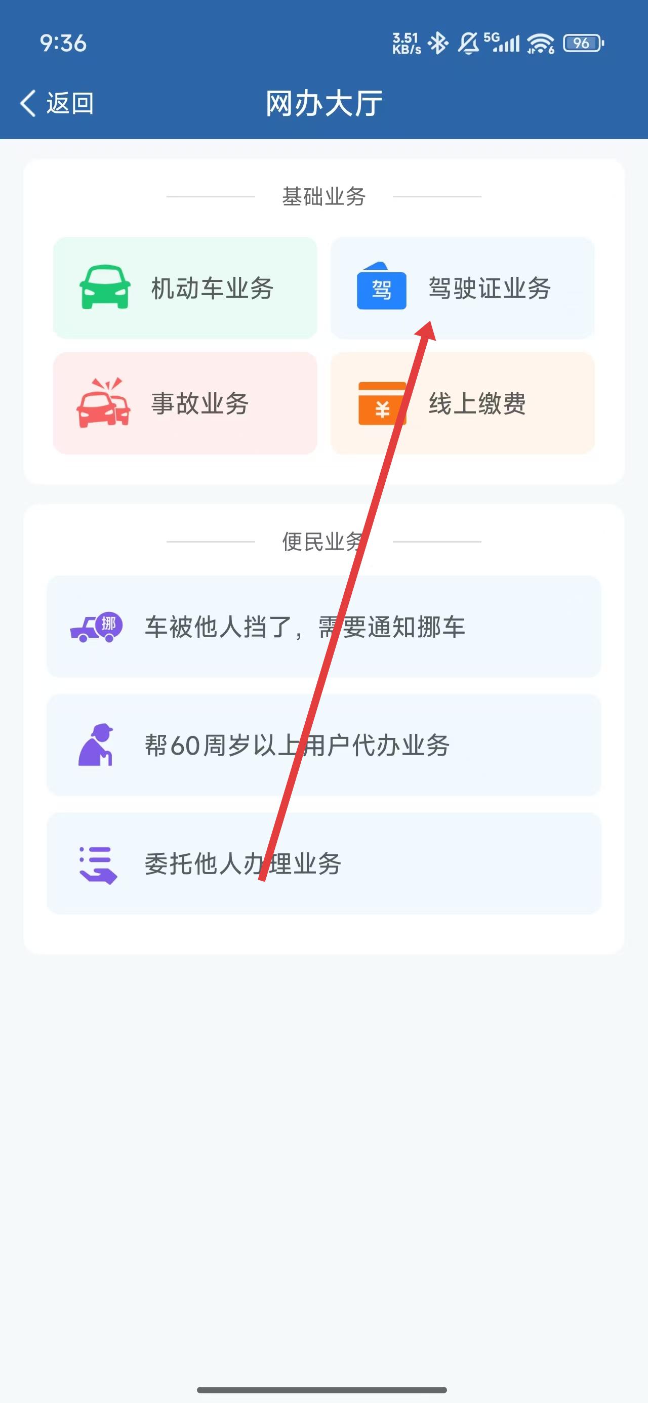 1、在网办大厅页面中,点击基础业务下的驾驶证业务,进入查看办理业务。