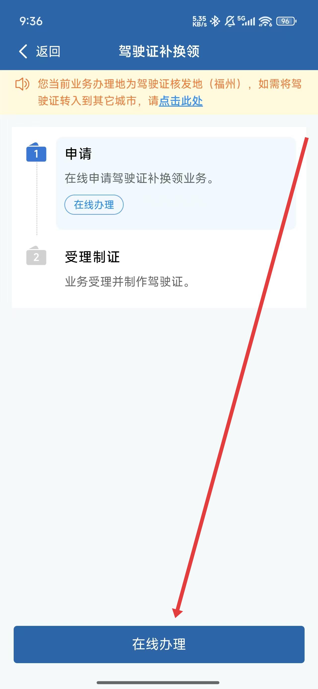 3、在跳转到驾驶证补换领页面时,点击底部的在线办理按钮,即可办理补换驾驶证。
