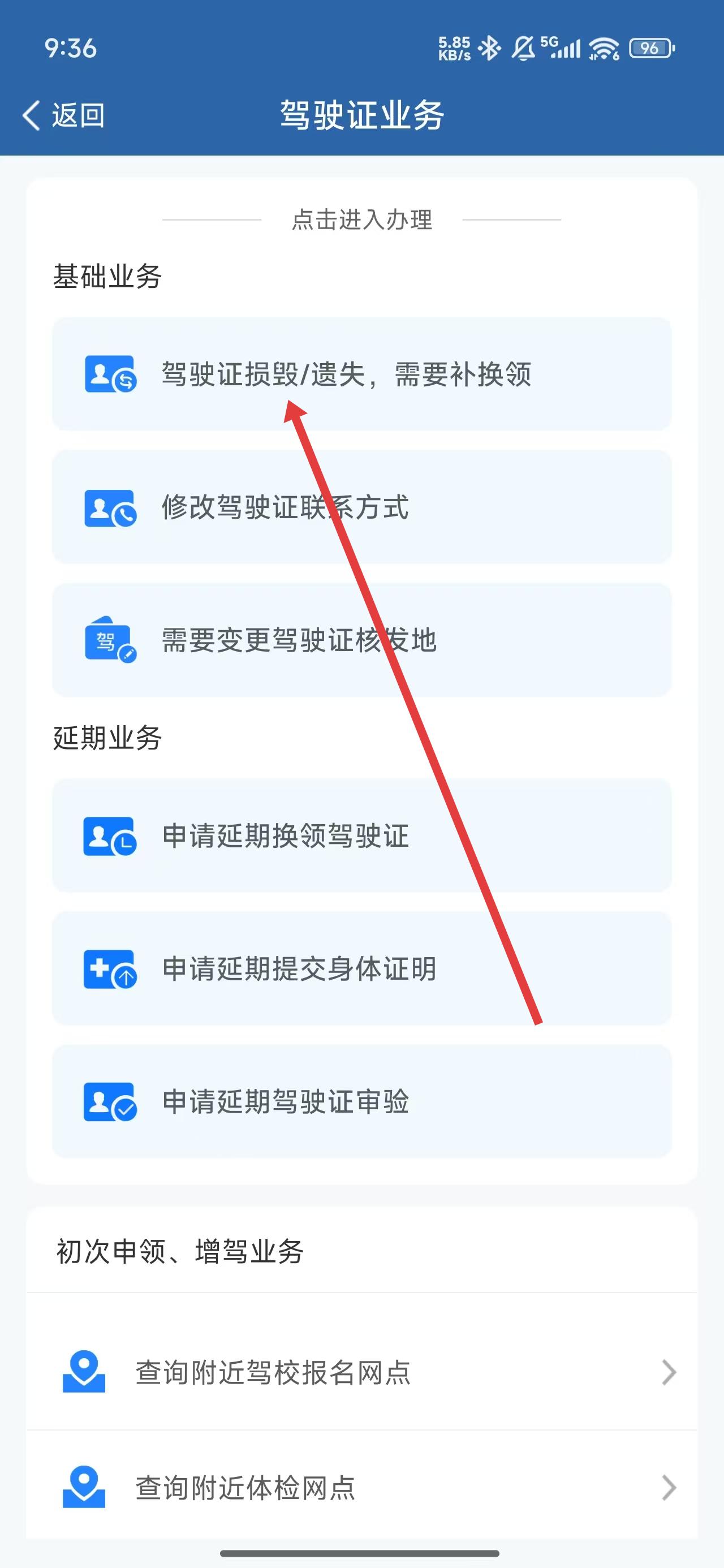2、在进入到驾驶证业务页面中后,若驾驶证损坏可以点击箭头指向的补换按钮。