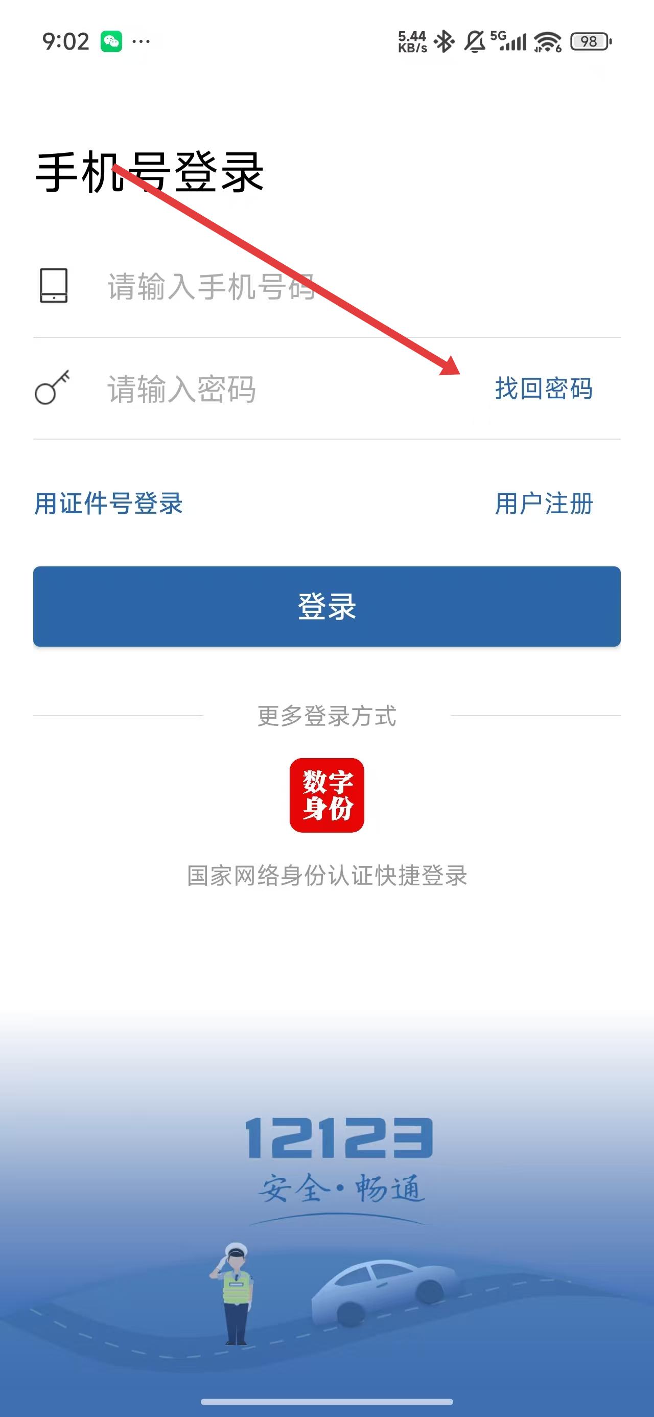 1、在交管12123登录页面中,如果忘记了密码可以点击找回密码按钮进行解决。