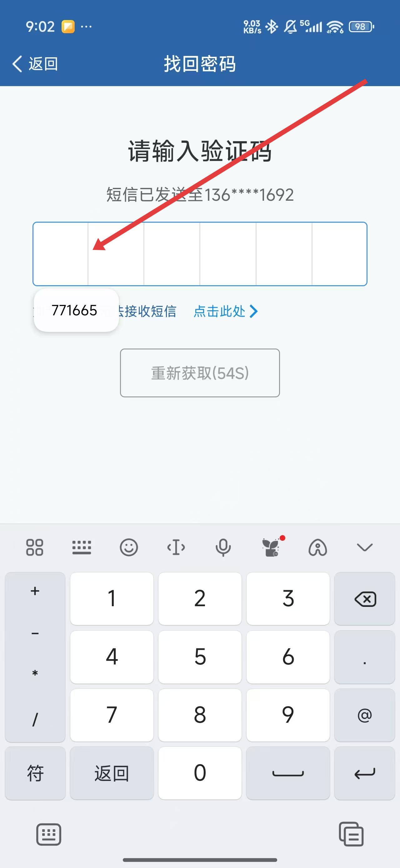 3、点击方框在方框中填写收到的短信验证码,后完成找回操作。