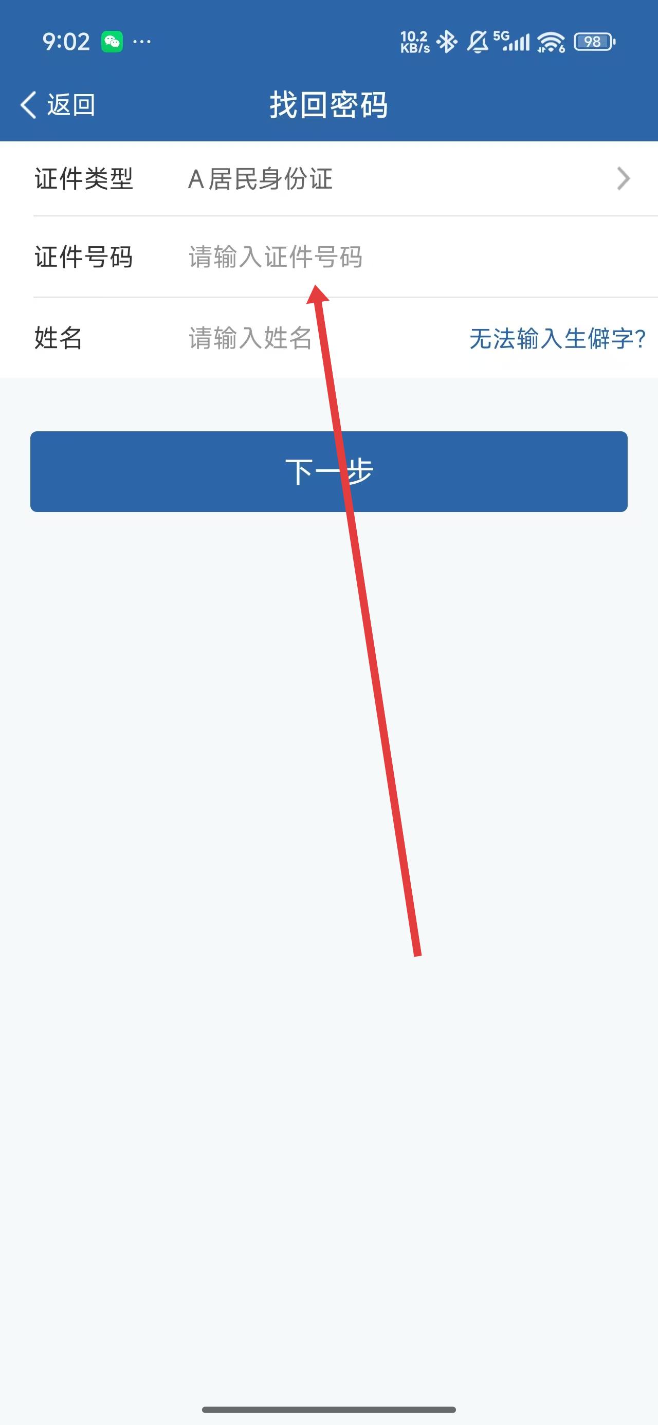 2、在进入到找回密码页面中,依次在输入框中输入相应信息后,进入下一步。