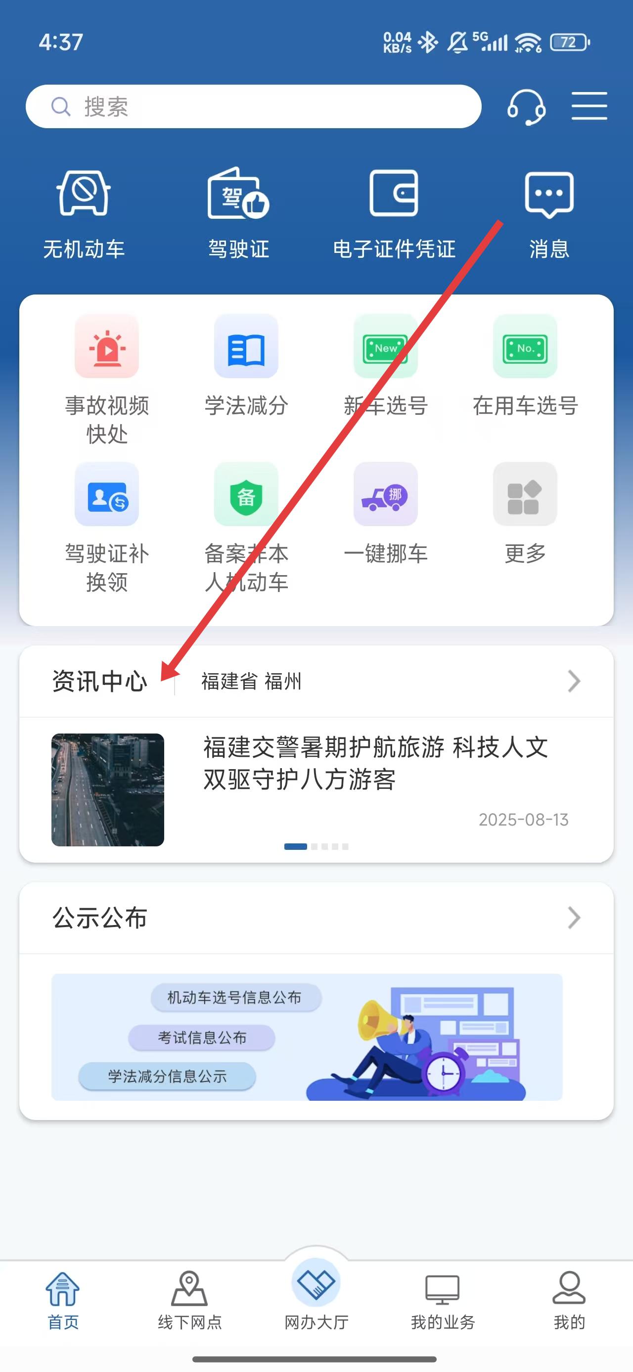 1、点击箭头指向资讯中心文字区域,即可进入查看最近资讯信息。