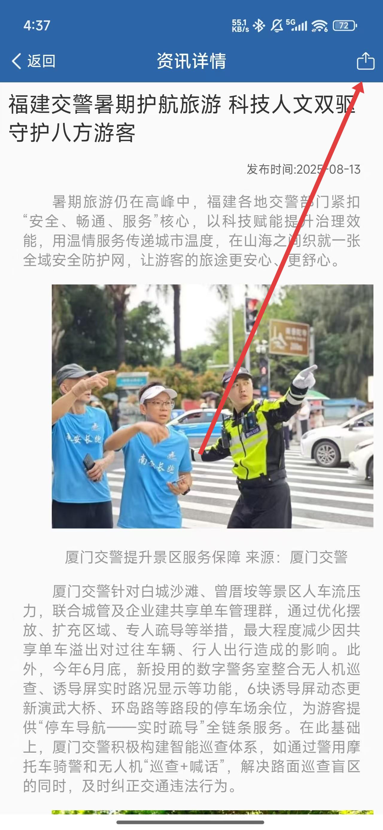 3、在资讯详情页面中,若想转发分享给朋友可以点击右上角图标。