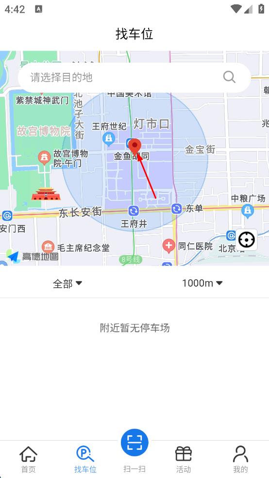 2、在找车位页面的搜索框输入目的地,地图将定位目标区域,若附近有停车场会显示相关信息。