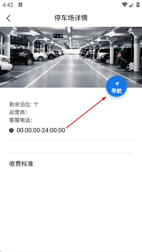 3、点击进入停车场详情页,查看剩余泊位、运营时间等内容,点击导航按钮,按指引前往停车场 。