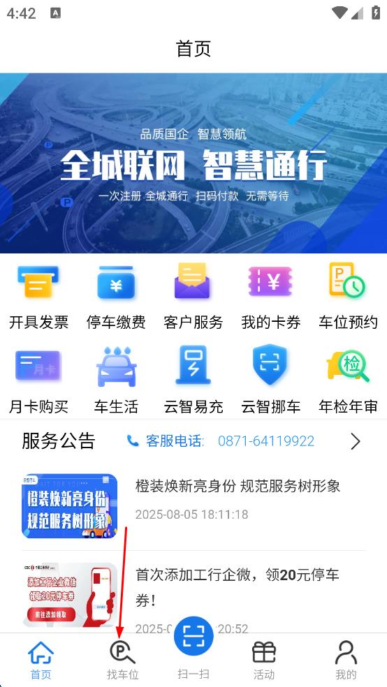 1、打开智慧通行APP,在首页点击找车位功能,进入找车位页面,地图会显示当前位置及周边区域。