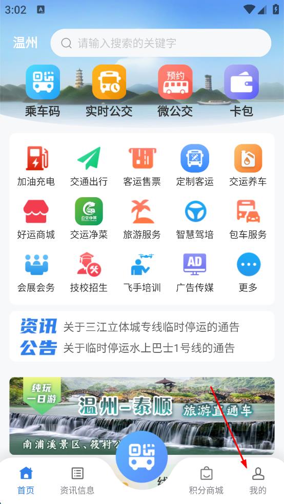 1、打开畅行温州软件,在主界面右下角找到“我的”选项,点击进入“我的”页面。