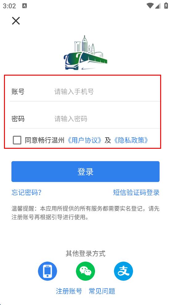 3、在登录界面,在“账号”输入框中输入自己的手机号,在“密码”输入框中输入密码,勾选“同意畅行温州《用户协议》及《隐私政策》”,然后点击“登录”按钮,即可完成登录。