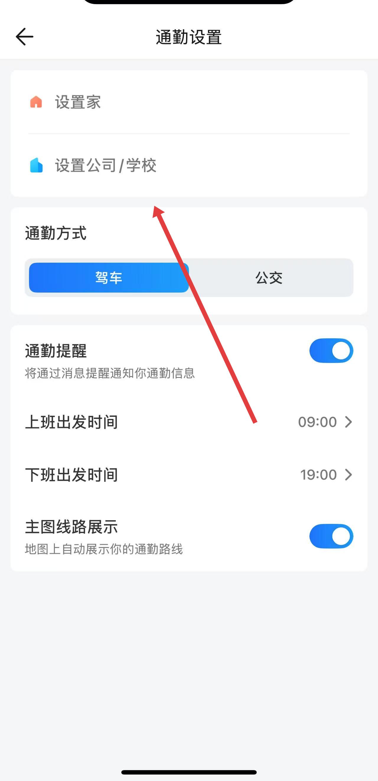 3、在通勤设置页面,点击设置家或设置公司/学校,输入对应的地址;还能选择通勤方式,设置通勤提醒的出发时间,以及决定是否开启主图线路展示。