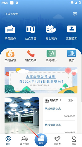 1、想要使用北京地铁这款app乘车极为简单,下载这款软件点击进入,来到软件的首页之中,点击下面中间最显眼的【乘车】;