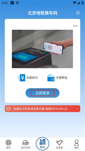 2、直接手机上就可以随时乘坐地铁,随时随地便捷的乘车服务,但是在乘车之前需要先点击【立即登录】才可以解锁自己的乘车账号;