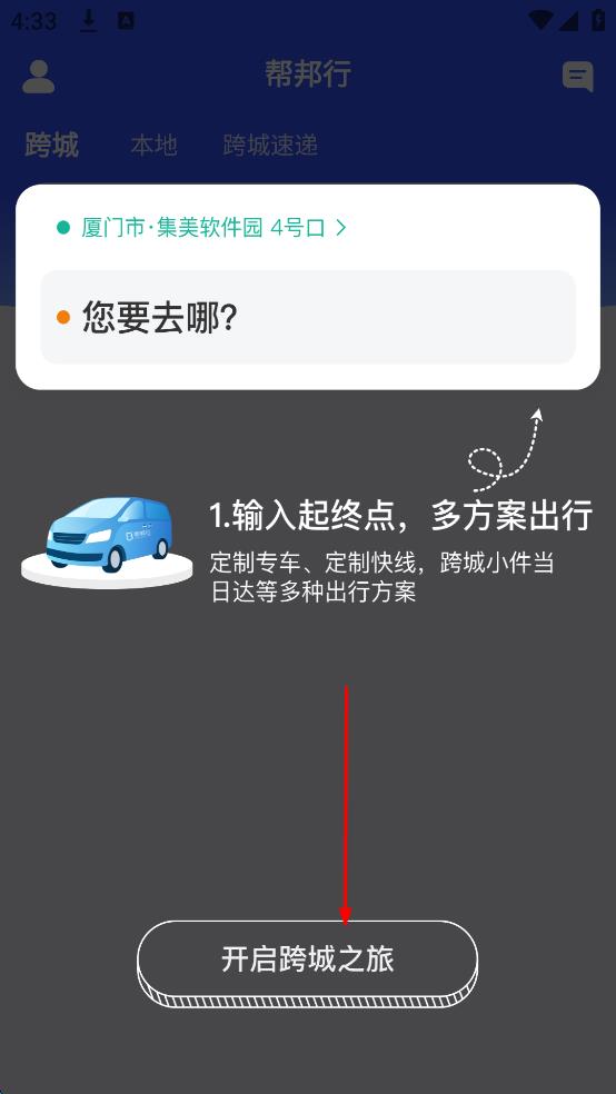 2、登录后进入首页,点击“开启跨城之旅”,进入行程规划页面,准备设置出行起终点 。
