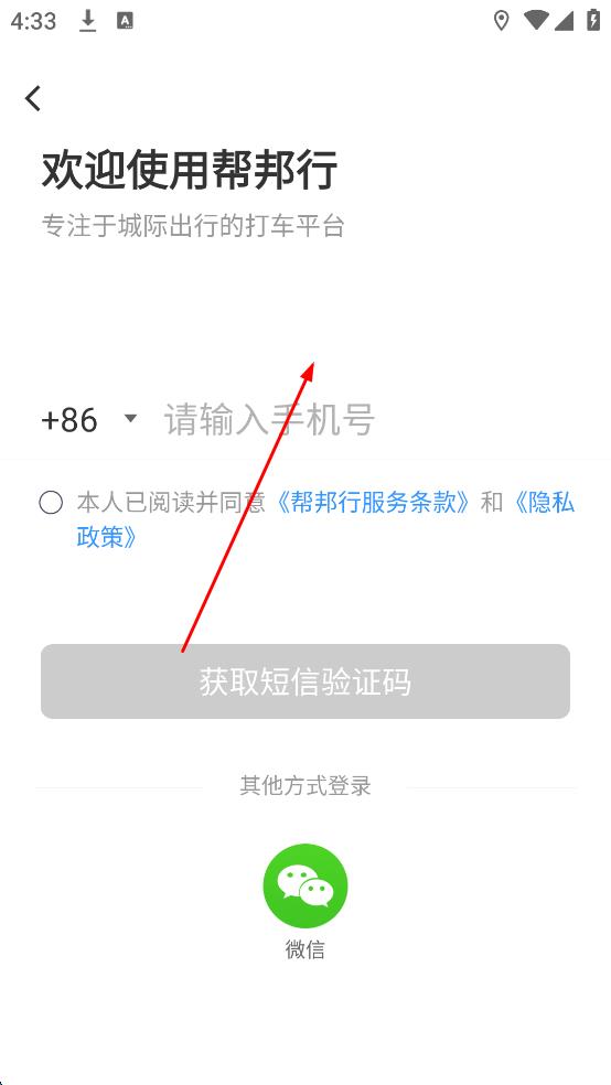 1、打开帮邦行APP,进入登录页面,勾选“本人已阅读并同意《帮邦行服务条款》和《隐私政策》”,输入手机号,点击“获取短信验证码”完成登录 。