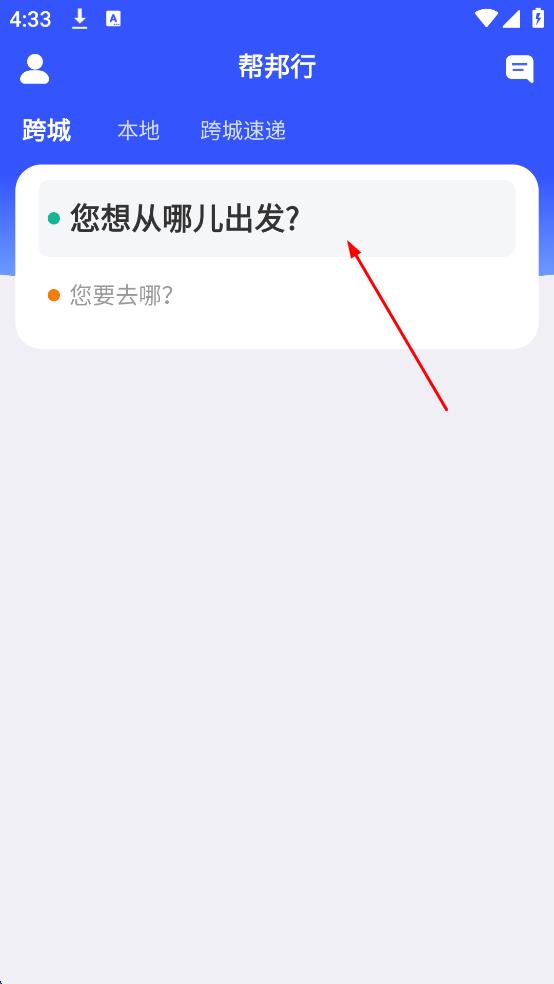 3、在行程规划页面,点击“您想从哪儿出发?”输入出发地,再点击“您要去哪?”输入目的地,即可规划跨城出行方案 。