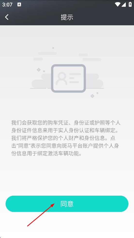 2、进入“提示”页面,阅读关于获取个人身份证件信息用于实人认证和车辆绑定的内容后,点击“同意”,授权信息使用。