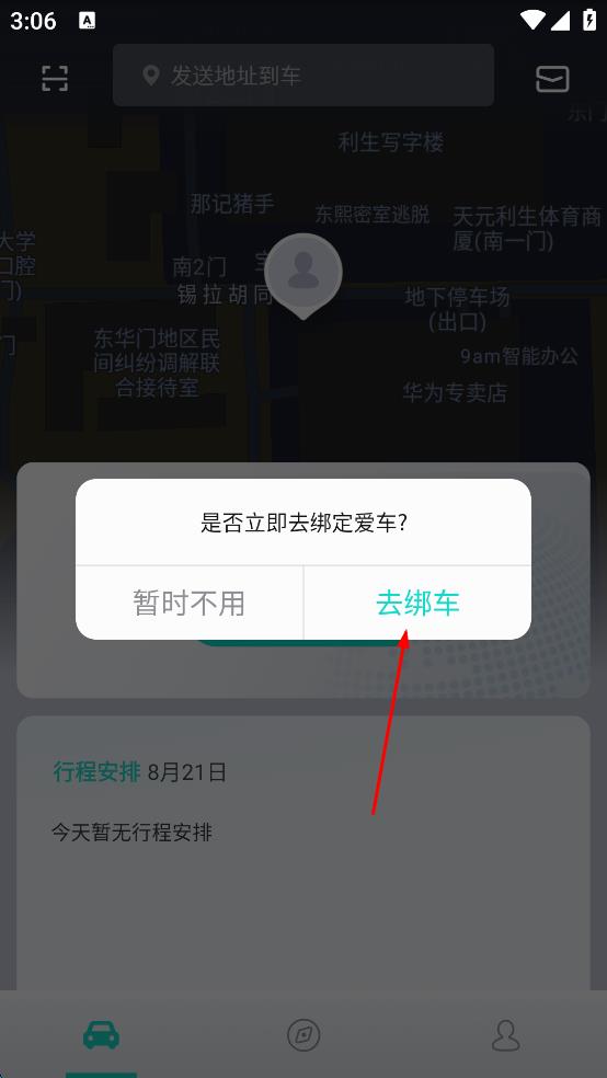 1、在软件提示“是否立即去绑定爱车”时,点击“去绑车”,进入绑车流程起始环节。