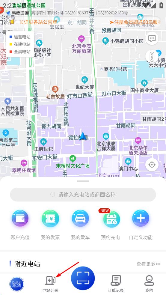1、打开充电软件,进入软件界面,在界面下方的功能栏里,找到标有“电站列表”字样的选项,点击该选项,进入电站列表页面。
