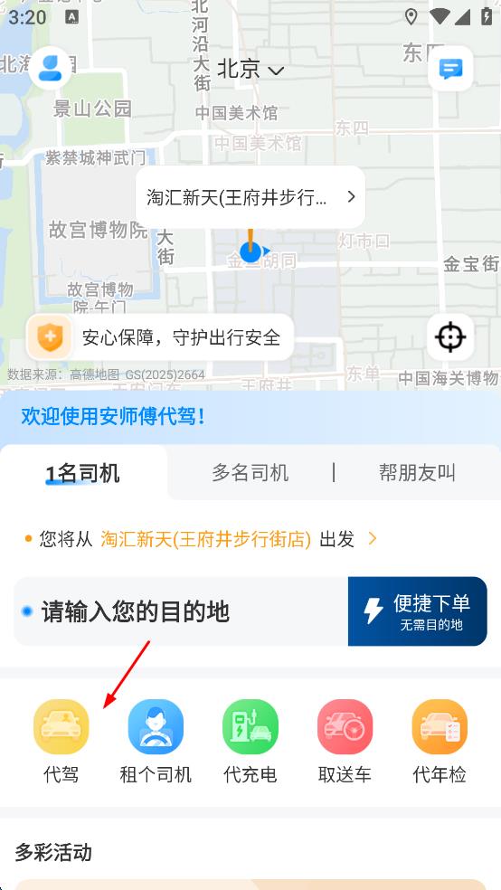 1、打开代驾服务软件,进入主界面后,点击“代驾”选项,进入代驾服务页面,在页面中找到“请输入您的目的地”输入框。