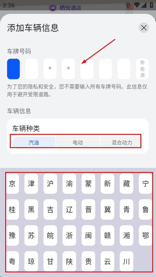 4、在添加车辆信息页面,输入车牌号码,选择车辆种类即可。