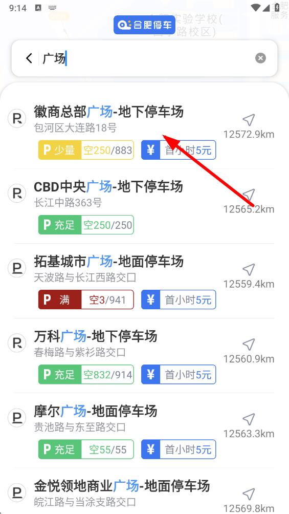 3、输入关键词后,会出现相关停车场列表,从中选择一个合适的停车场,比如点击徽商总部广场地下停车场,查看该停车场详细信息。