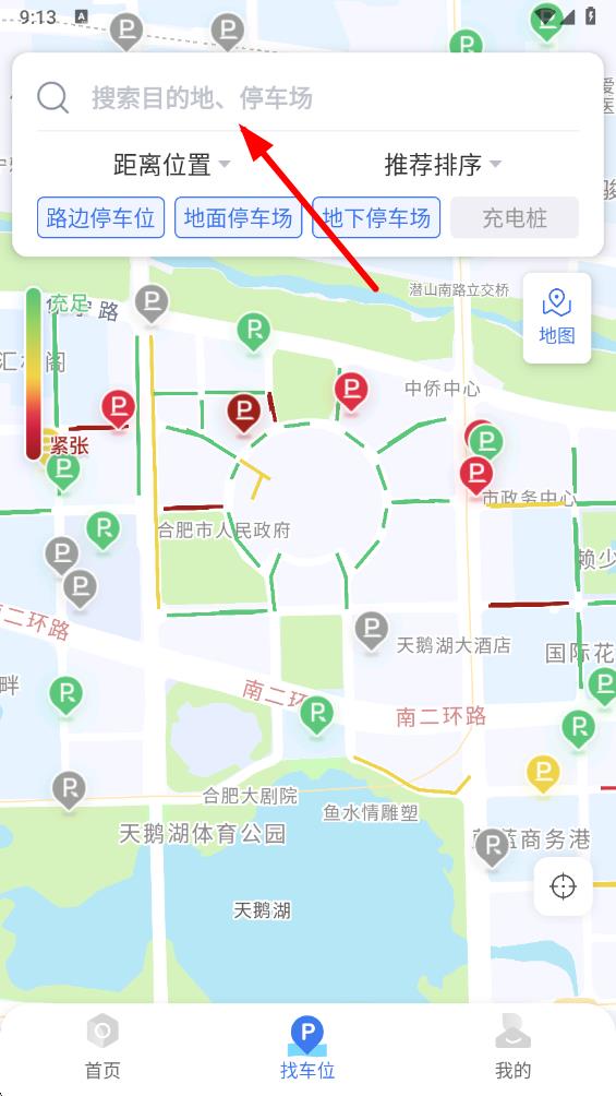 2、进入找车位页面后,在顶部的搜索框中输入目的地或停车场相关的关键词,可快速定位目标区域的车位情况。